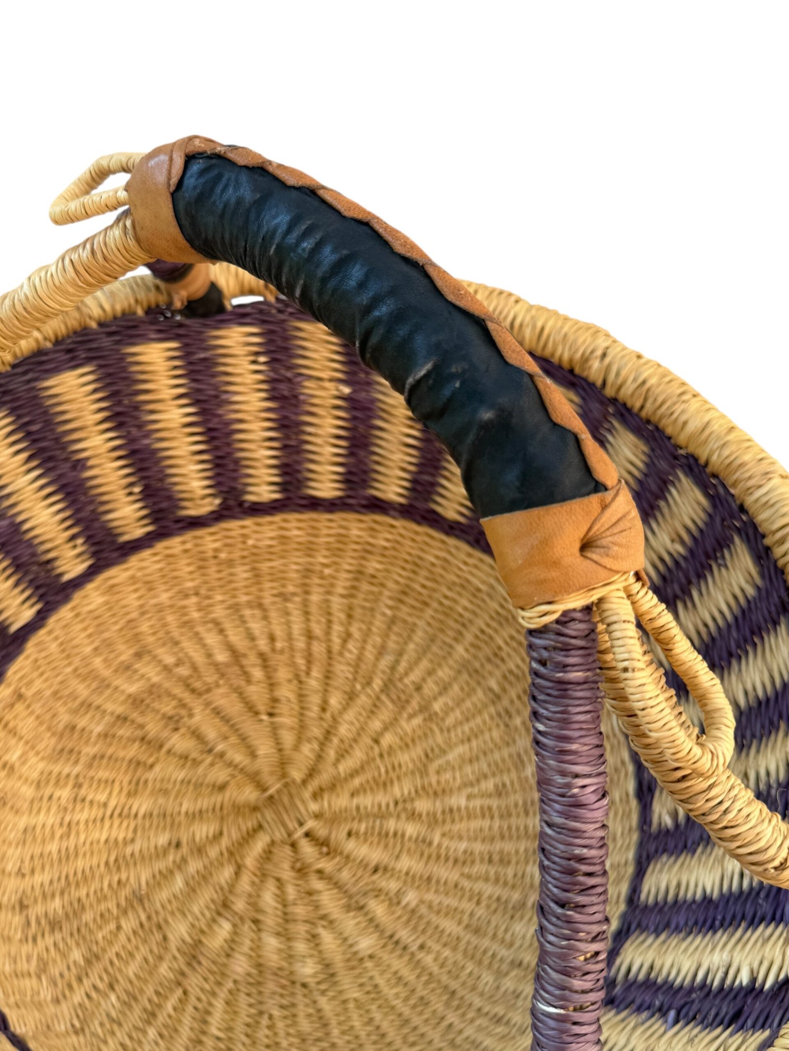 A basket with a handle wrapped in leather