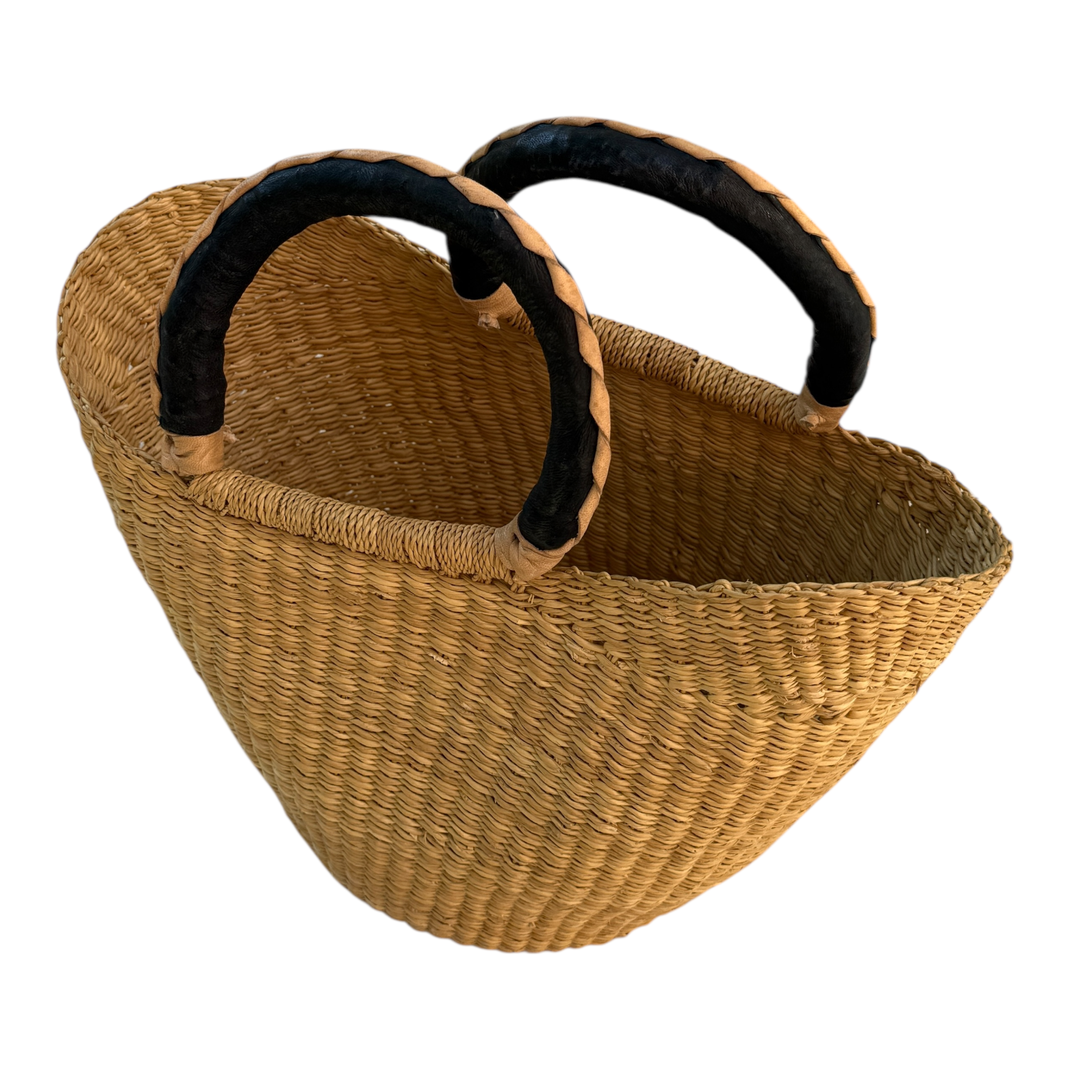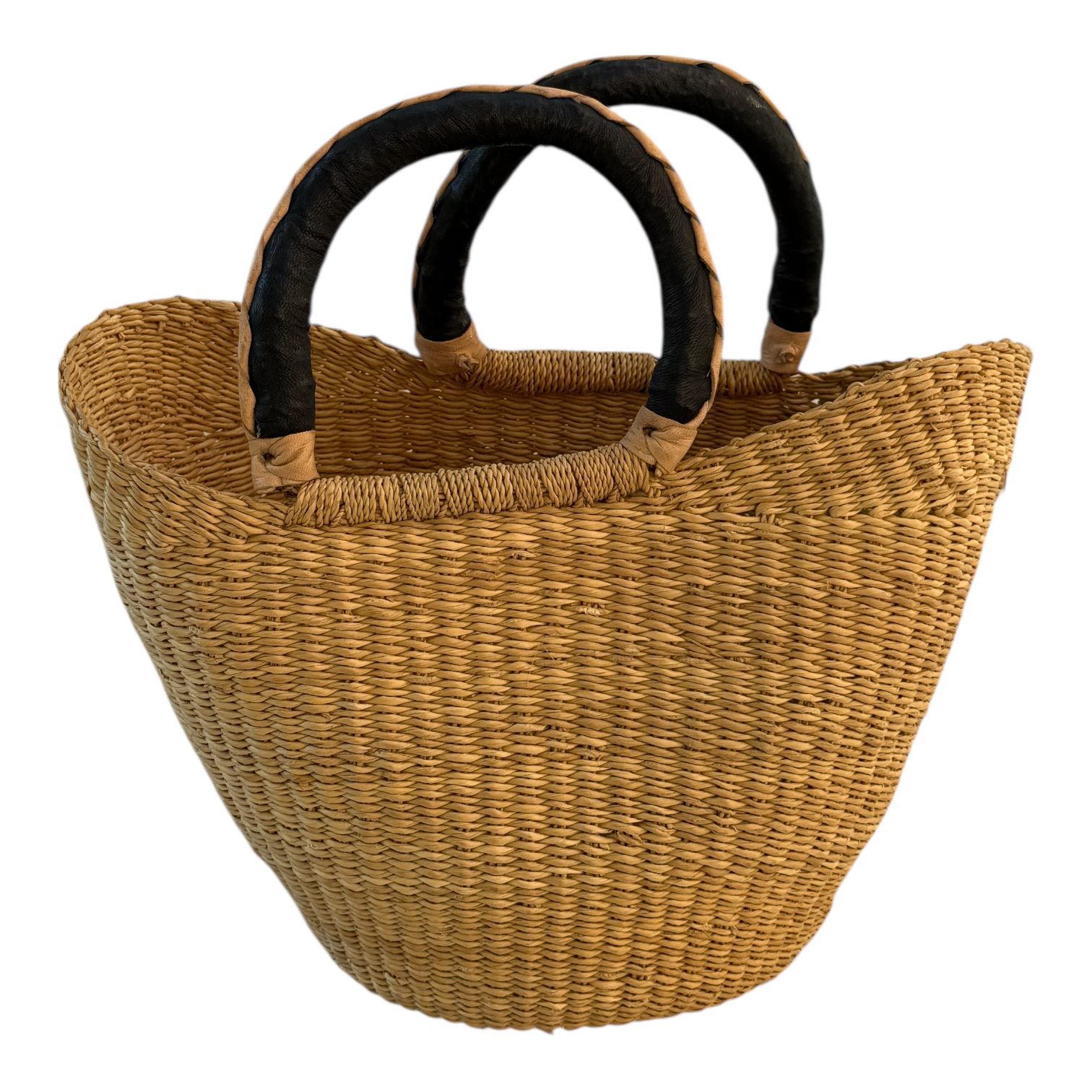 Handcrafted in Ghana, this Shopping Small Natural Color basket blends tradition, artistry, and practicality. Each piece is woven by skilled artisans, supporting their communities while bringing elegance and function to your home. Perfect for shopping, storage, or decoration, it’s more than a basket — it’s a story you can carry. The combination of the leather handle and natural color give this basket a striking look based on its simplicity.